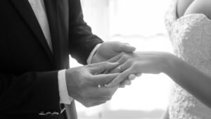 Groom putting diamond engagement ring on bride’s finger